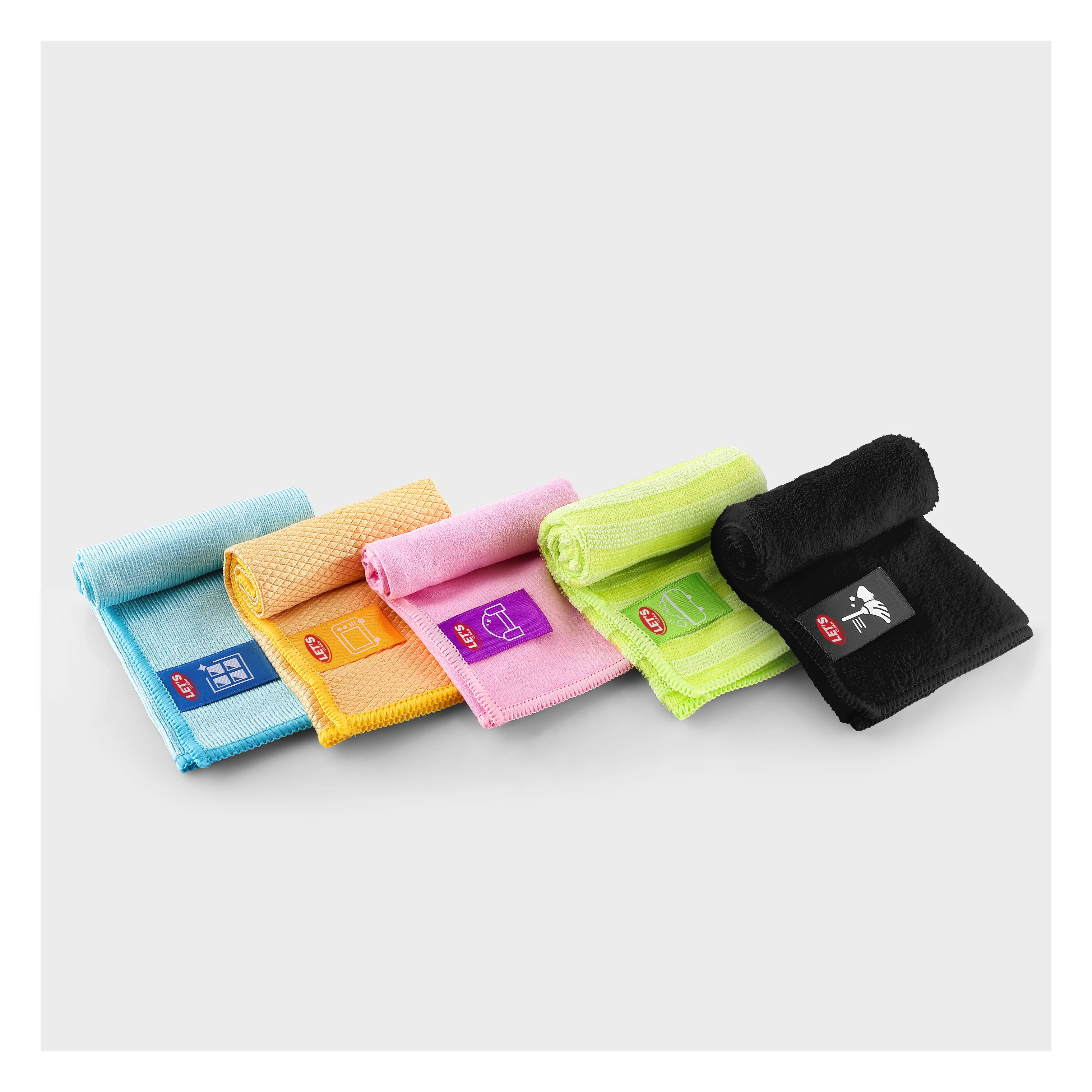 The pack includes 5 multi-purpose microfiber cloths, each designed for a specific cleaning area: